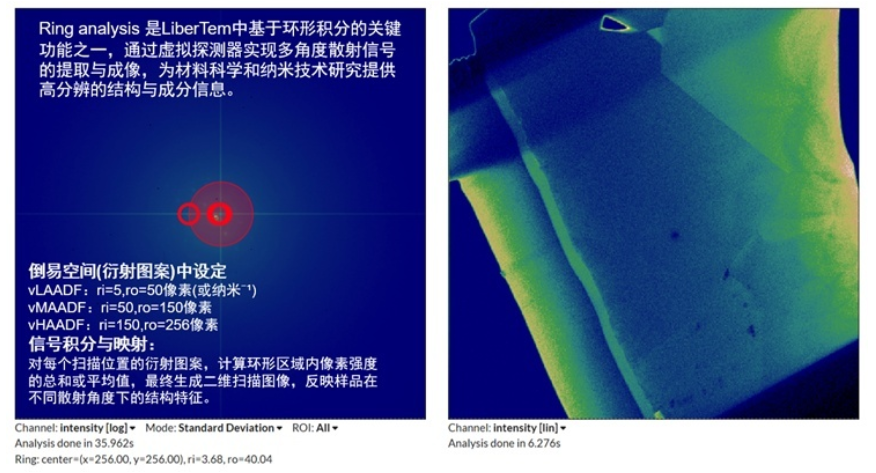 3. 虚拟多模态成像:结合开源软件 LiberTEM,Felis T3 采集的 4D 数据可虚拟不同角度范围的散射探测器,实现如 vLAADF、vMAADF、vHAADF 等多模式成像。其中,低角环形暗场像可揭示轻元素分布, 高角形暗场像则可突出晶界与位错等缺陷信息。