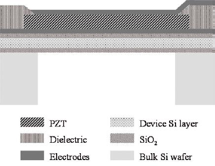 pMUT的结构由一个柔性压电膜覆盖的腔体构成,这些膜根据施加的电学刺激产生机械变形。压电膜是使用旋转涂层工艺沉积到具有Ti/Pt电极层的SOI基底上的。压电膜和电极层是通过光刻的技术形成基元二维阵列的。在这些pMUTs器件上,腔体、压电膜和电极层被放置到一个特定的结构上从而产生预期的操作。