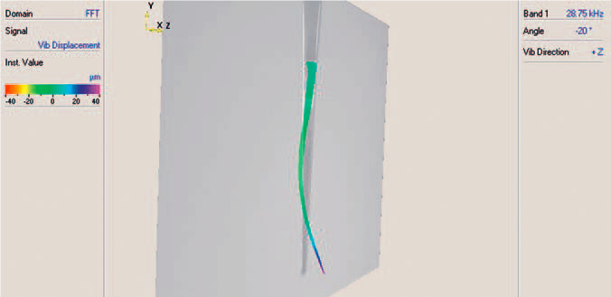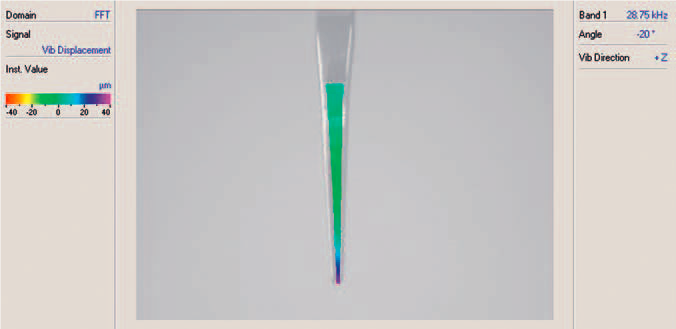 图3 中的位移数据显示为彩色图,图4 中的是洁牙器尖端形变动画叠加在图像上的截图。计算机生成的振动动画可以快速简单地对尖端动作进行评判。从数据上看,尖端振动位移幅值的最大值发生在自由端。另外,扫描式激光测振仪可以测试出水流,信号发生器功率以及尖端/牙齿接触载荷是如何影响洁牙器振动参数的。