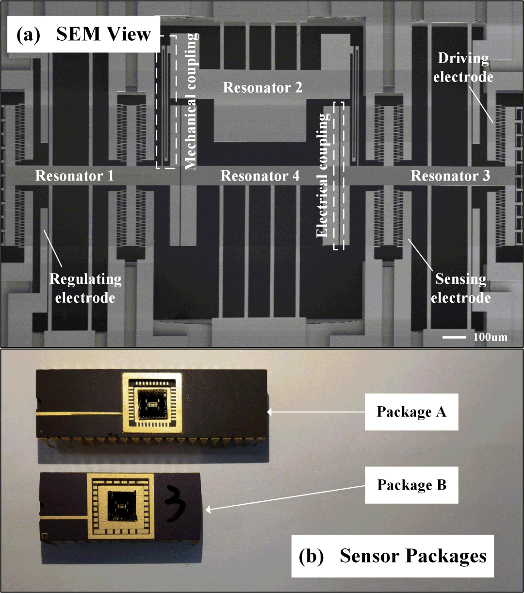 耦合谐振器阵列可用于加速度的传感,并实现可调灵敏度的功能。通过标准SOI工艺加工得到的弱耦合加速度计如图1所示。图1(a)为加速度计中的耦合谐振器阵列SEM图像,图1(b)展示了同一批次加工的加速度计采用的两种不同的封装,封装A采用了RTV硅橡胶点涂四角后在干燥箱中60度烘干2.5小时进行固化,由此引入了较大的残余应力,而封装B采用环氧树脂胶点涂四角后常温固化。