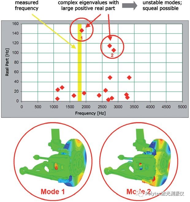 图3显示的是本征值分析结果。在这次试验中,找到两个导致尖锐噪音的可疑频率。最后经验证,仅其中之一是尖锐噪音的产生频率。