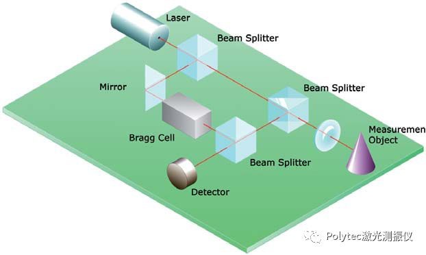 基于光学多普勒效应,设备核心为一台高精度激光干涉仪,输出激光照射到被测物表面上,同时收集返回设备的激光,经干涉产生正比于被测物体表面速度的多普勒频移信号(频移信号很小,约10-8,这就要求干涉仪具有极高的精度),该信号经内置于控制器内的解码器运算处理,输出被测物的速度和位移。