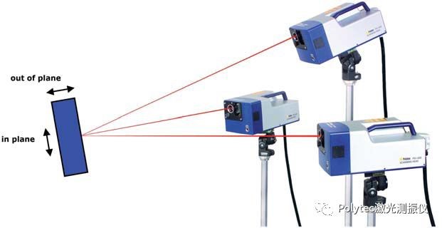 3D扫描式激光测振仪使用三个独立激光头,如下图,测振系统从不同的空间方向获取每个测量点的振动数据。