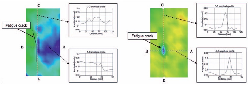 图3 使用LAMB波检测金属结构的疲劳裂纹:75Hz时面内振动(左)和352Hz时面外振动(右)