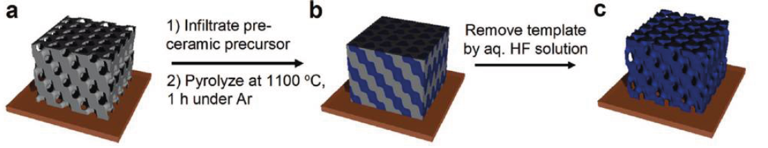 美国宾夕法尼亚大学Shu Yang课题组采用3D陶瓷模板法合成3D结构纳米材料,在用氢氟酸去除3D陶瓷模板后,为了保持得到的三维纳米材料结构,采用了CO2超临界点干燥的方法对3D纳米材料进行了干燥,可以很好的保持了类似3D陶瓷结构的纳米材料的三维结构。其合成路径如下: