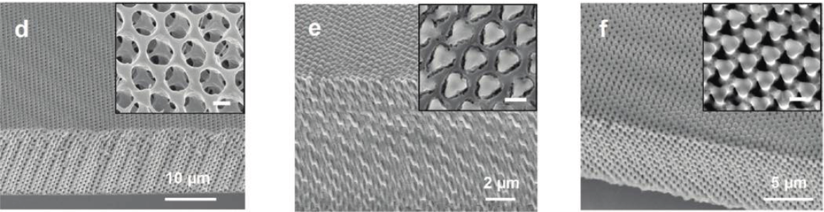 图2中d为合成材料与陶瓷模板复合物电镜图,e为氩气氛围下进行1100°C高温煅烧后的电镜图,f为去除氢氟酸后等到的反转陶瓷3D结构的3D纳米材料电镜图