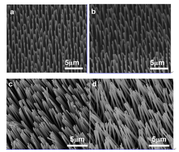 图3中的a和b为采用了超临界点干燥处理的纳米阵列材料,c和d为没有采用超临界点干燥处理的同样的纳米阵列材料。通过对比可以发现,没有采用超临界点干燥处理的纳米阵列材料会发生凝聚,阵列之间会大幅聚合在一起,而采用超临界点干燥处理后,聚合现象等到了明显的解决,能够比较好的保持其阵列结构。