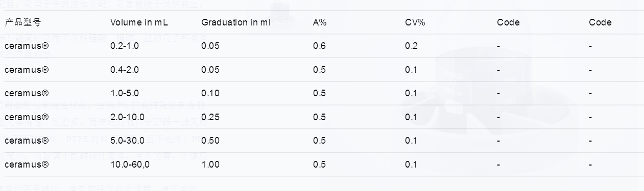与液体接触部分都采用耐磨耐化学腐蚀材料,由99.7% 的高纯陶瓷制成的活塞,光滑、耐高温、耐化学腐蚀、耐磨损,而传统的瓶口分配器一般采用PTFE、PFA ,玻璃等作为套筒的材料,PTFE 材料不耐磨,且不光滑;PFA 遇浓硝酸,浓盐酸会膨胀变形;而玻璃不能耐碱性液体,且不耐磨,不适应盐类液体。